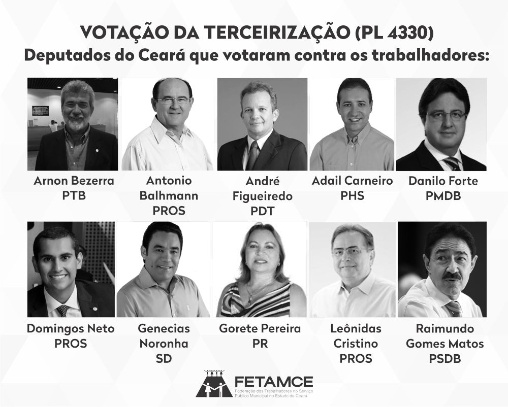 O ato destacou ainda os deputados cearenses que traíram os trabalhadores, ao aprovar o texto base do projeto na última semana na Câmara de Deputados.